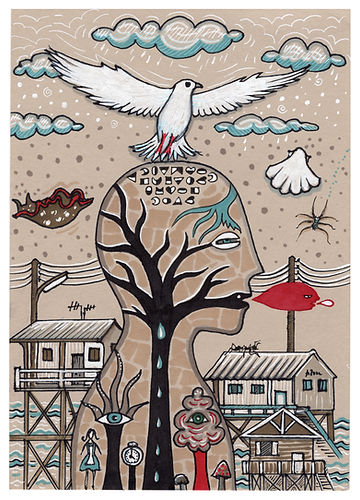 Without any formal artistic training, he emphasizes the imperfections of his drawing, developing a naive, surreal, and unique style. He experiments with different types of media and techniques.